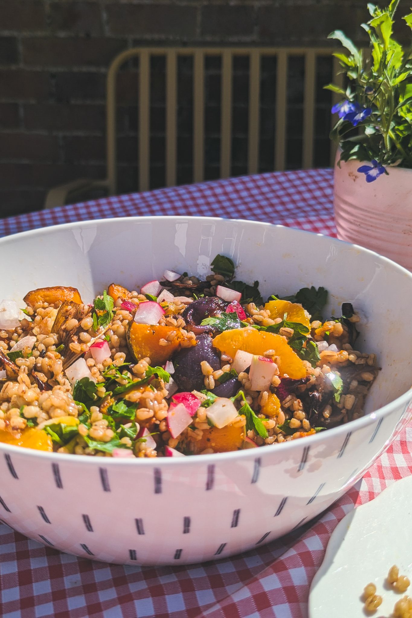 We've a super simple warm salad as a new recipe this month. It's using our delicious Crown Prince Squash which is so flavoursome, tossed in Field Blend's spice mix and Hodmedod's Naked Pearl Barley. It's the perfect accompaniment alongside BBQ meat, makes a great packed lunch or a comforting stand alone dish. Make the most of this beauty of a squash before the storing season finally comes to a close