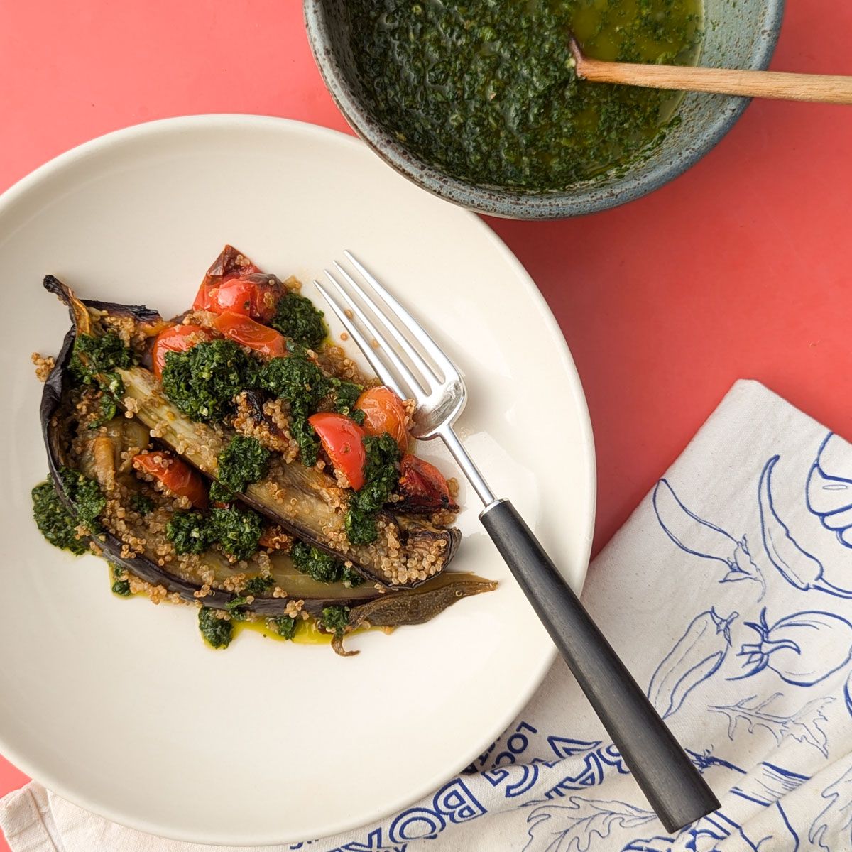 August's recipe: Butter roasted aubergines & tomatoes with Hodmedod's Smoke Quinoa & spicy zhoug.