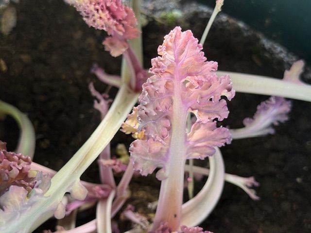 We've been experimenting in the glasshouses, with forced sea kale. In the wild, you'll see it growing along shingle beaches, with cabbage-like leaves and it has a sprouty flavour. We've been starving it of light or forcing it and it's very tender and much sweeter as a result. Add one to your box, toss with a little lemony dressing and add it to a salad. Do let us know what you think!