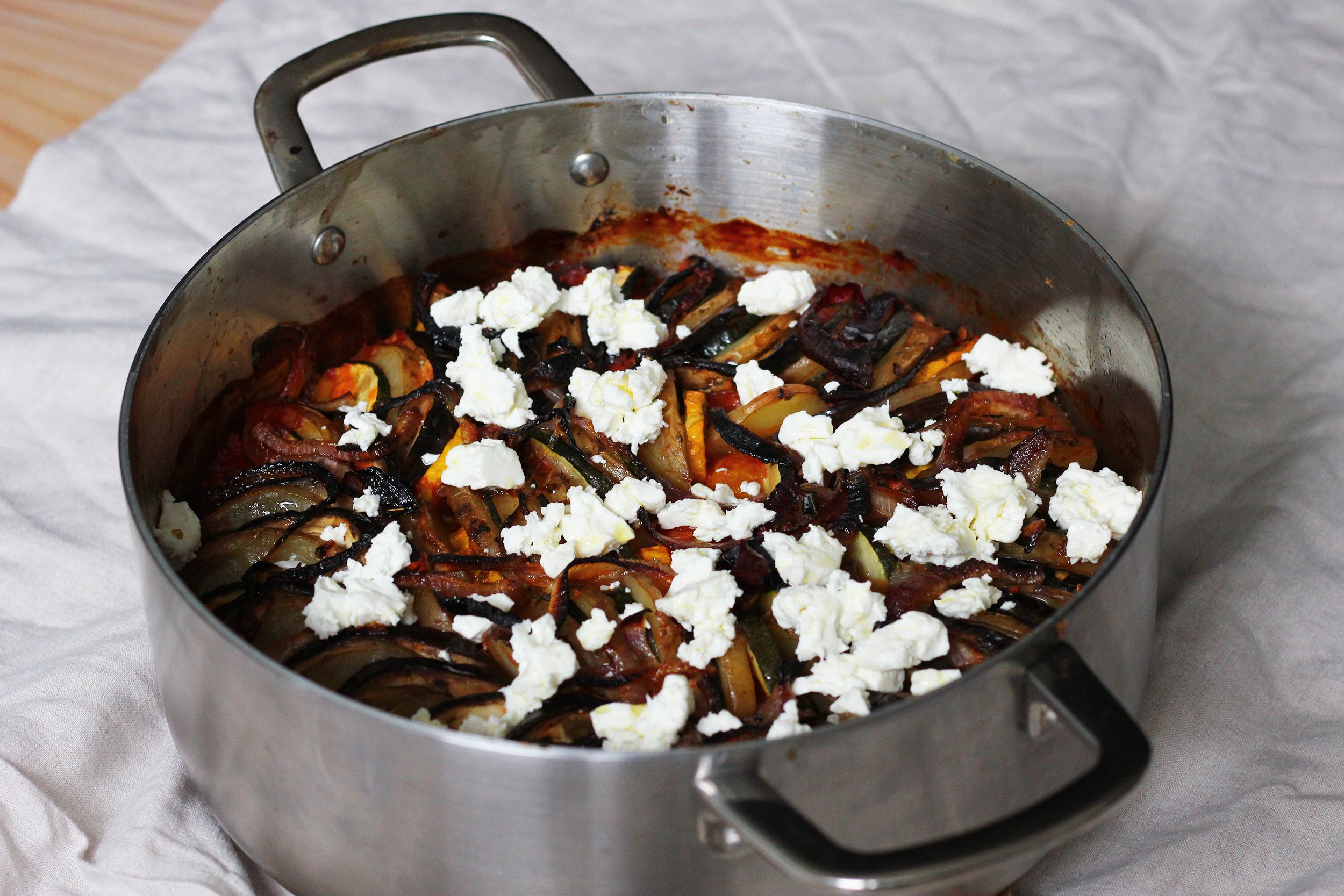 Place in the oven with a lid on or cover with foil. Bake covered in the oven for 1 hour and then take the lid off and bake for another hour , for the last 30 mins turn the temp up to 220c and cook until the veg is soft and caramelised on top. Serve with feta cheese either crumbled on top or on the side.