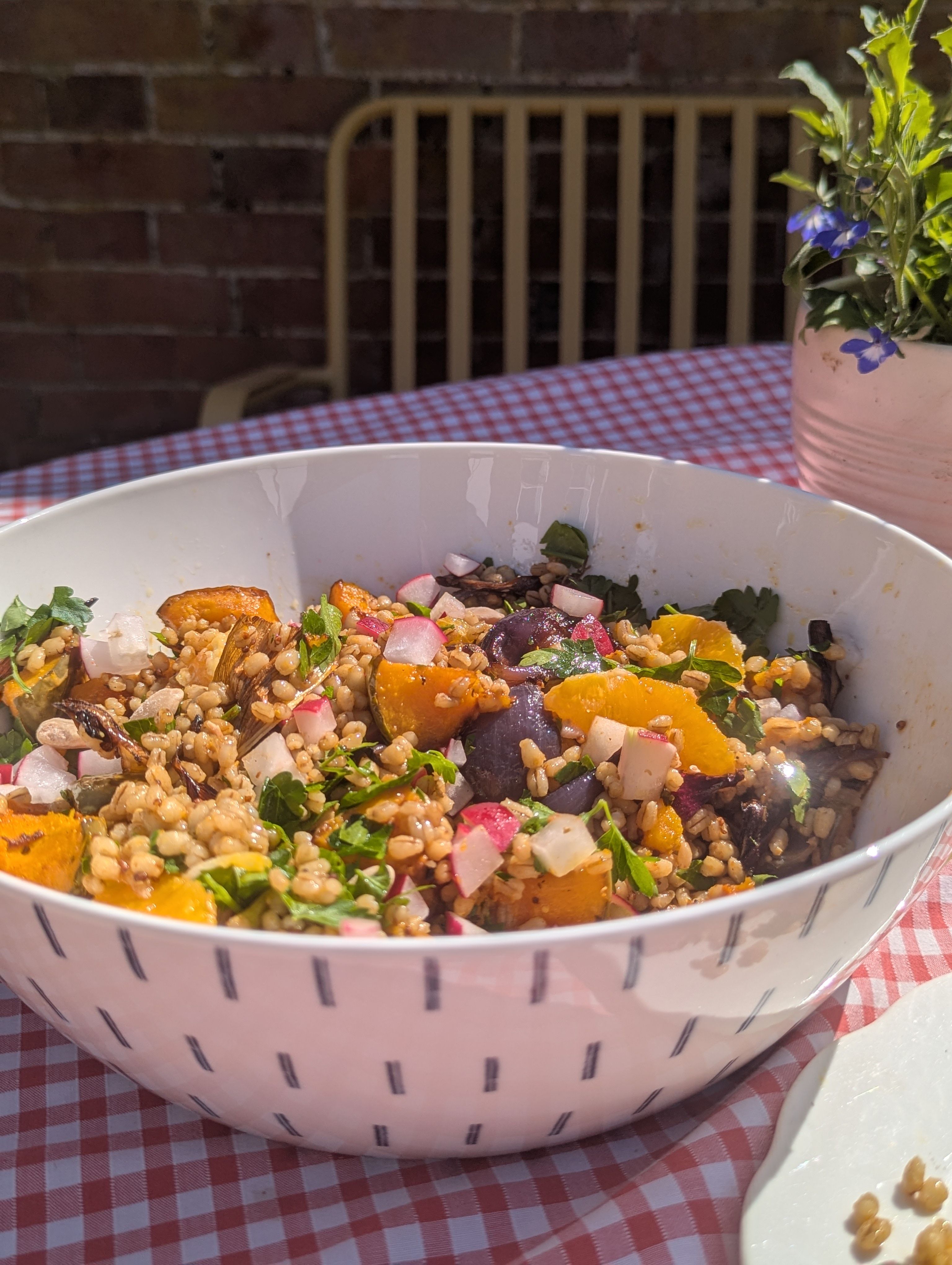 4- In a large serving bowl, peel and segment the orange catching juice in the big bowl, putting the segments aside. Add the other ingredients for the dressing and whisk together. Tip the veg and barley into the dressing, add the chopped parsley radishes and stir well. Then scatter over the orange segments and almonds.